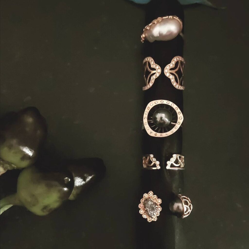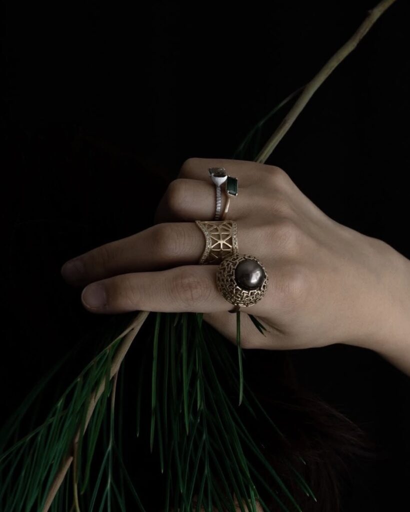 その後ジュエリーデザインと制作を学び、ジュエリーデザイナーとして企画・製作に携わってきました。布から宝石へ。表現の手段は変わっても、素材の持つ個性を引き出すというアプローチは一貫しています。